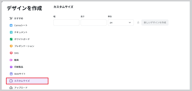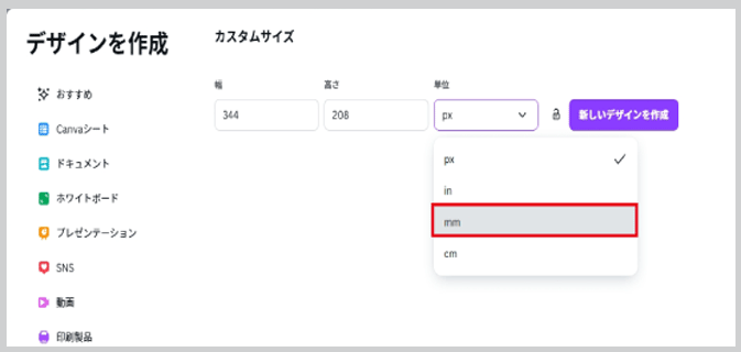 デザインを作成から「カスタムサイズ」を選択し、単位を「px」から「mm」に変更してください。