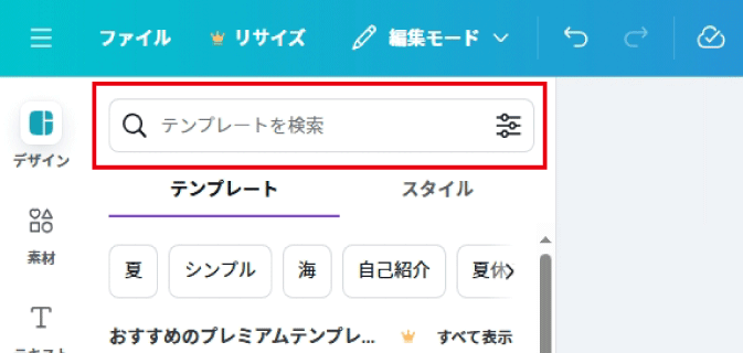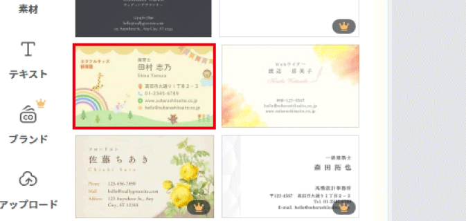 名刺のデザインを作成します。テンプレートから作成する場合は、左メニュー「テンプレートを検索」から検索してください。